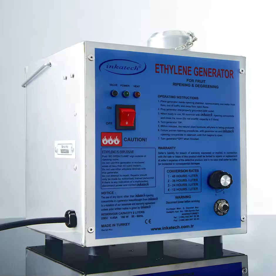 Etilen jeneratörleri, sadece muz değil, narenciye ve domates gibi birçok meyve ve sebzenin olgunlaştırılmasında kullanılan modern ve güvenli cihazlardır. Eski sistem olan tüplü mekanizmalara kıyasla patlama riski taşımaz ve oldukça güvenlidir. Kullanımı kolaydır ve taşıma ya da değiştirme gibi zorluklarla uğraşılmaz. Ayrıca, Inkatech tarafından üretilen özel etilen sıvısı, sarartma işlemlerinde pratik ve etkili bir çözüm sunar.